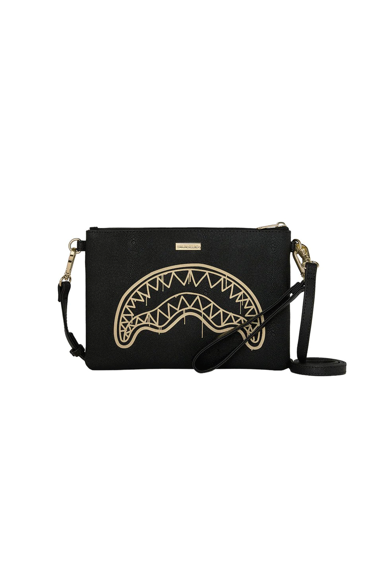 Functionality and character come together in the new That Gold Drap clutch bag with shoulder strap by Sprayground: a single-color accessory featuring the iconic Shark Mouth motif in gold, adding a touch of glamour and sophistication.
