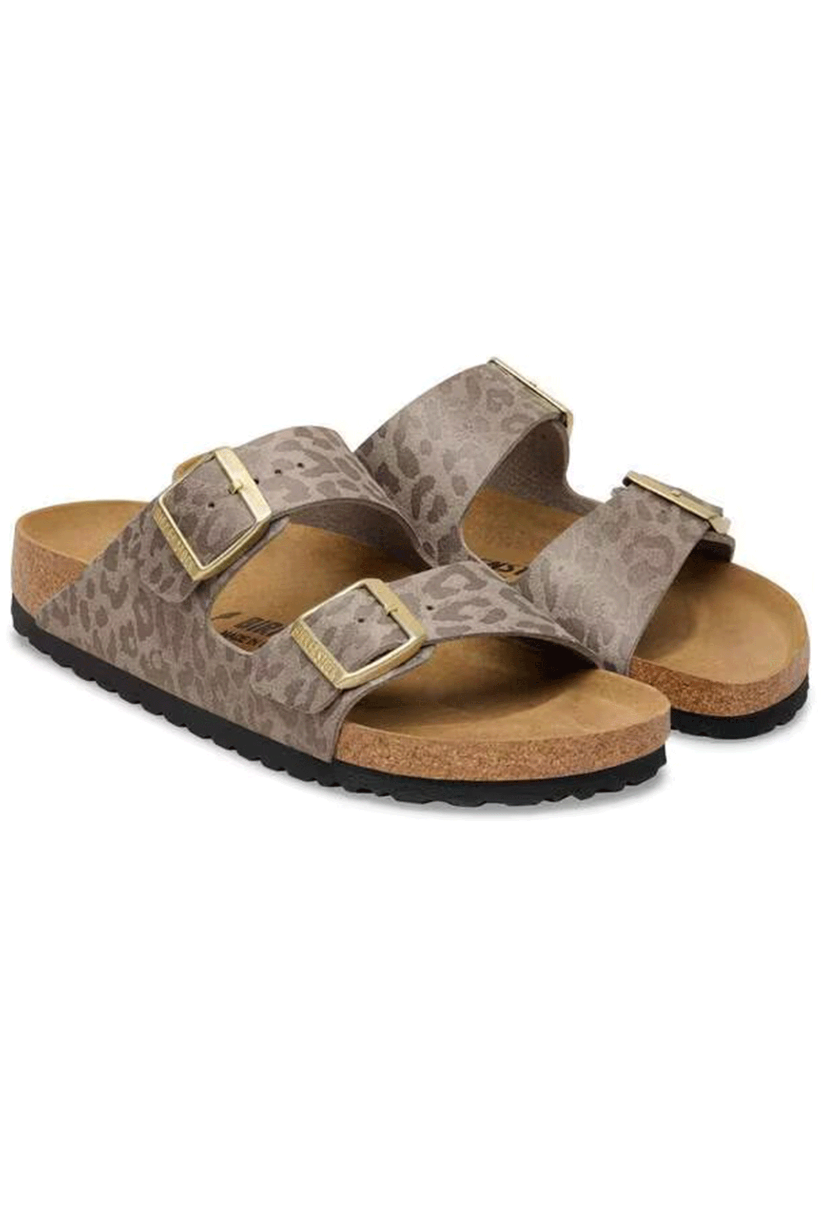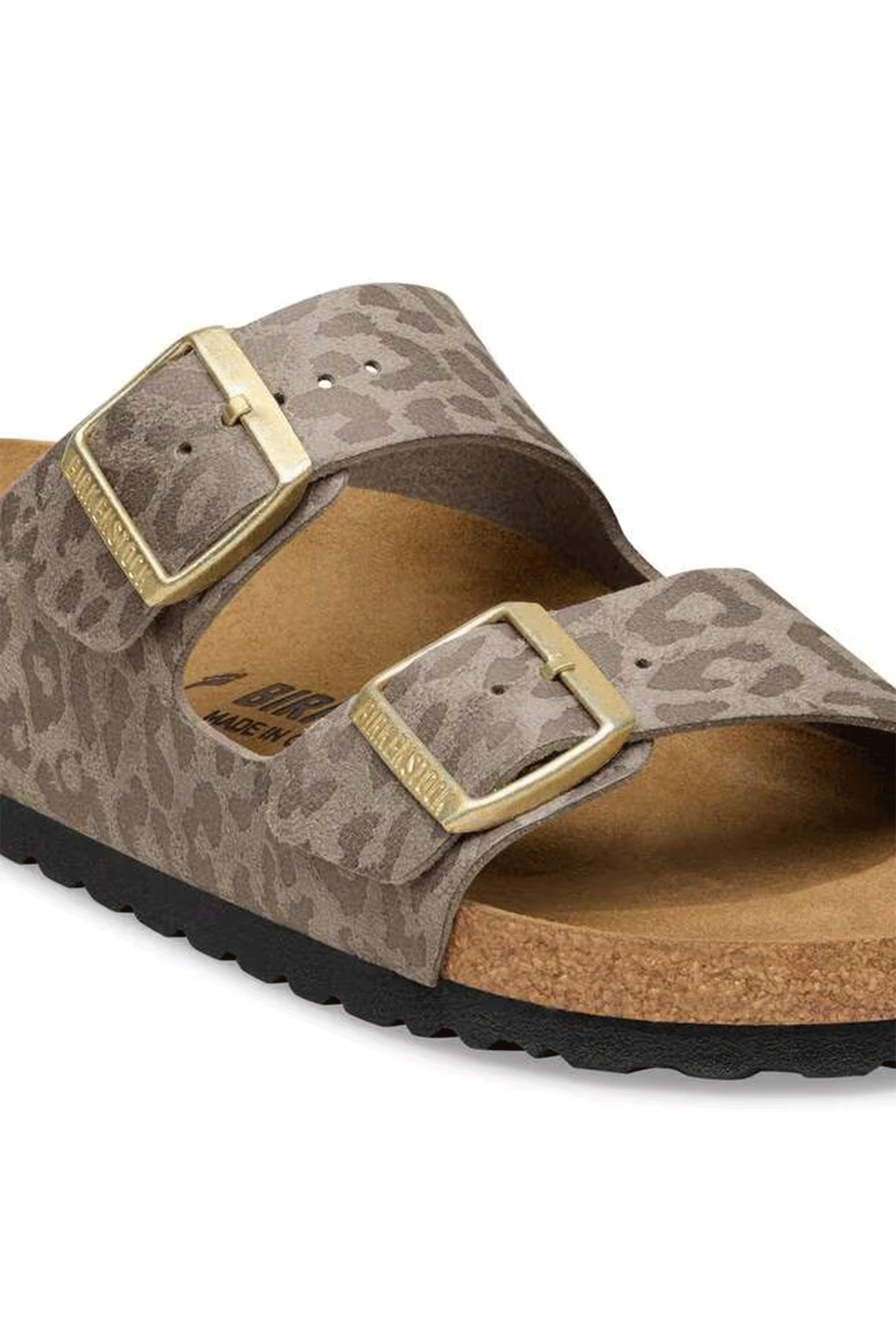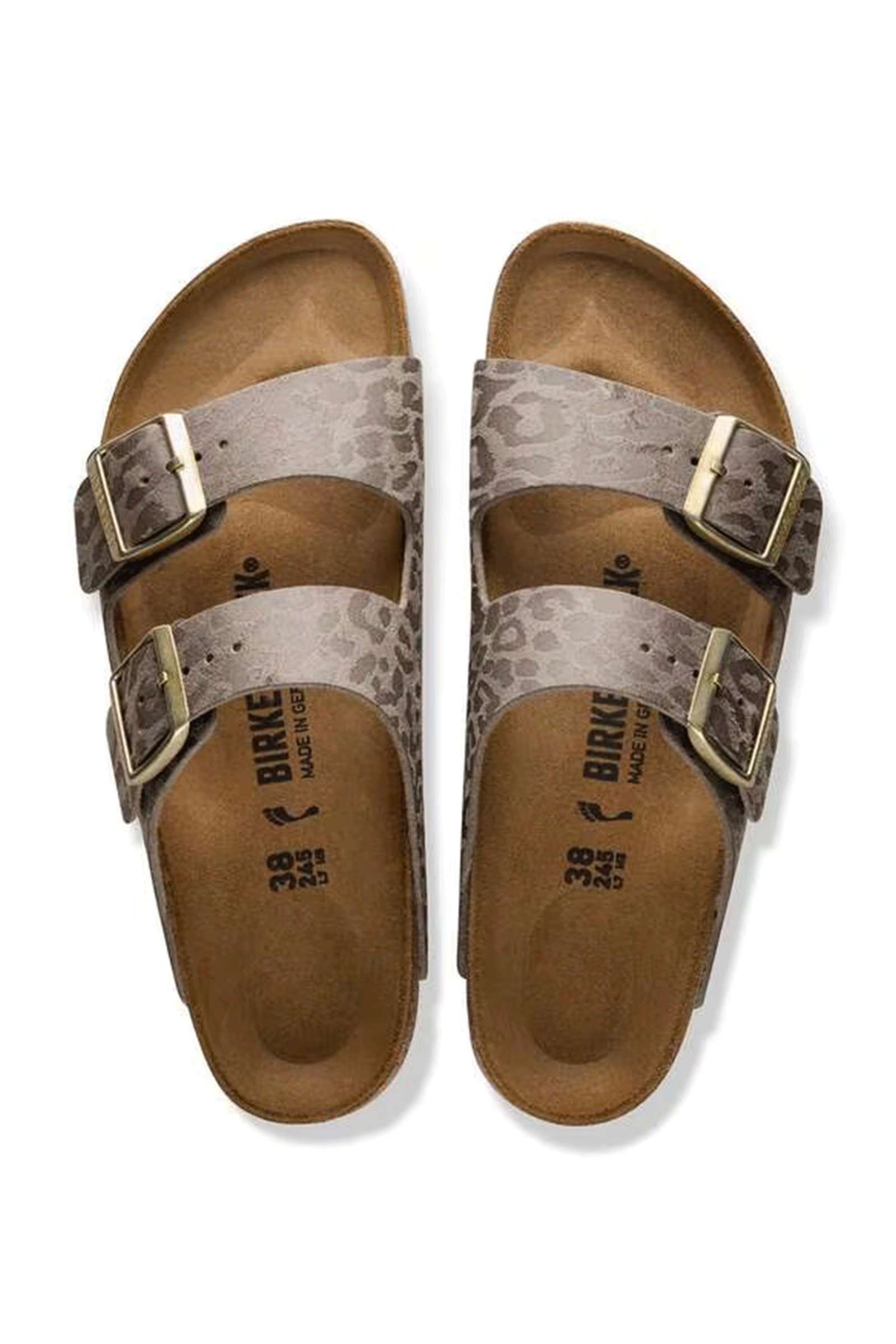 Divenuto ormai da anni il sandalo di tendenza dell'estate amato indifferentemente da uomini e donne, l'Arizona di Birkenstock è stato progettato per garantire una calzata ultra confortevole senza precedenti. Il plantare in lattice e in sughero presenta infatti una forma anatomica addolcita che avvolge delicatamente il piede, cui si aggiunge un sottopiede in pelle scamosciata per un tocco soffice e la suola in EVA per un comfort ad ogni passo. La tomaia è in ecopelle, caratterizzata da un pattern animalier che aggiunge un tocco glamour. I due cinturini con fibbie metalliche logate sono regolabili singolarmente, così da ottenere una calzata personalizzata. Logo Birkenstock inciso lateralmente. Prodotto Made in Germany.